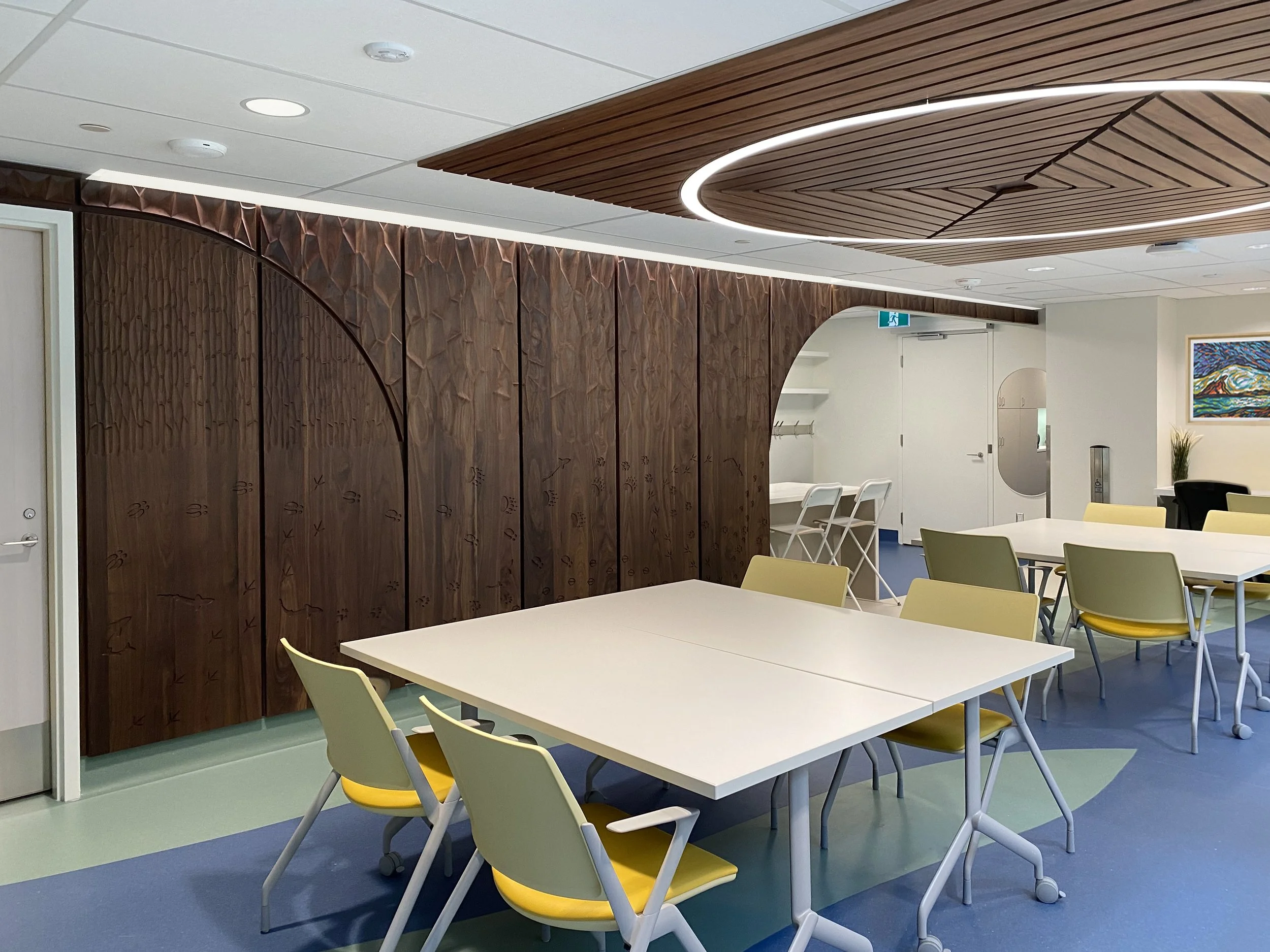 Natural materials, culturally significant motifs, and symbolic patterns were carefully incorporated to foster a sense of belonging and help mitigate the historical trauma often associated with colonial medical environments. Privacy screens, a wood-accented ceiling, artwork display areas, and thoughtfully composed interior elements reflect Indigenous narratives and priorities, while remaining fully aligned with the operational and clinical requirements of a busy acute-care hospital.